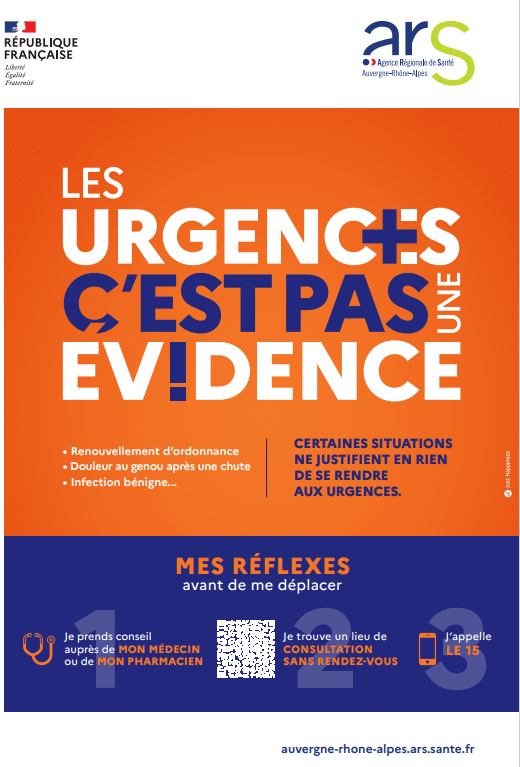 En cette période de congés de fin d’année et en prévision de la circulation des virus de l’hiver, l’ARS Auvergne-Rhône-Alpes lance de nouveau sa campagne de communication « Les urgences, c’est pas une évidence ». Afin de diffuser le plus largement ce message, nous vous remercions pour le relais que vous pourrez faire des supports de sensibilisation. Pour rappel, cette campagne de communication met l’accent sur les bons réflexes à adopter lorsqu’on a besoin de soins rapidement : 1. Prendre conseil auprès de son médecin ou de son pharmacien 2. Trouver un lieu de consultation sans rendez-vous 3. Appeler le 15 (ou le 114 pour les personnes sourdes ou malentendantes) |